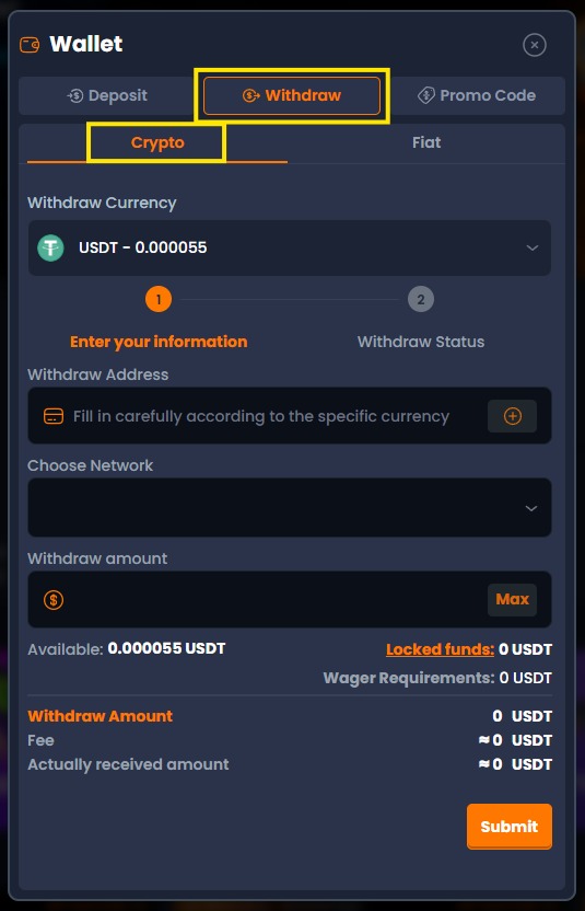 The Wallet page will open; here, click on the "Withdrawal" option and select Cryptocurrency.